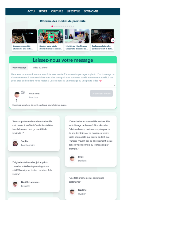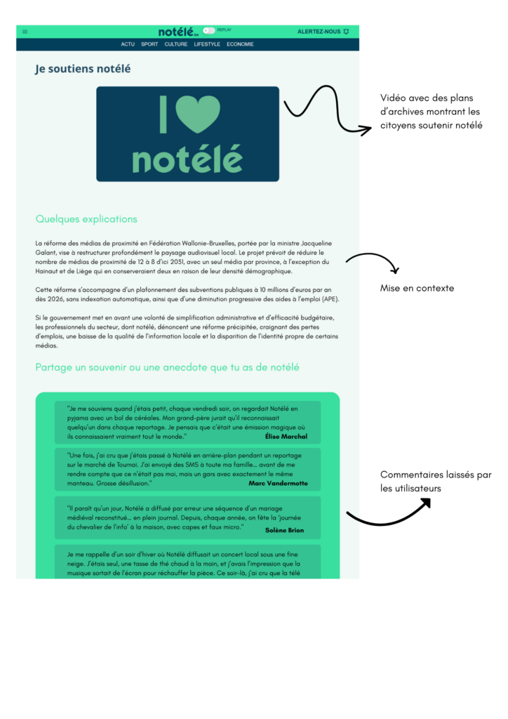Parmi les actions prévues dans cette stratégie digitale, figure la création d’une page web « I love Notélé ». Elle aura pour objectif de recueillir des témoignages, souvenirs et anecdotes liés à Notélé. Cette initiative permettra à la fois de sensibiliser le public à la réforme des médias de proximité et de renforcer le soutien envers Notélé.